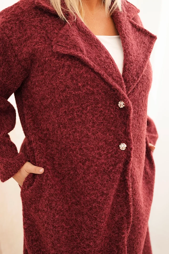 Płaszcz zapinany jest na dwa guziki, co dodaje mu klasycznego charakteru. Szeroki kołnierz pięknie układa się przy szyi, podkreślając szyk całej stylizacji. Materiał z delikatną fakturą dodaje wyjątkowego uroku i oryginalności.