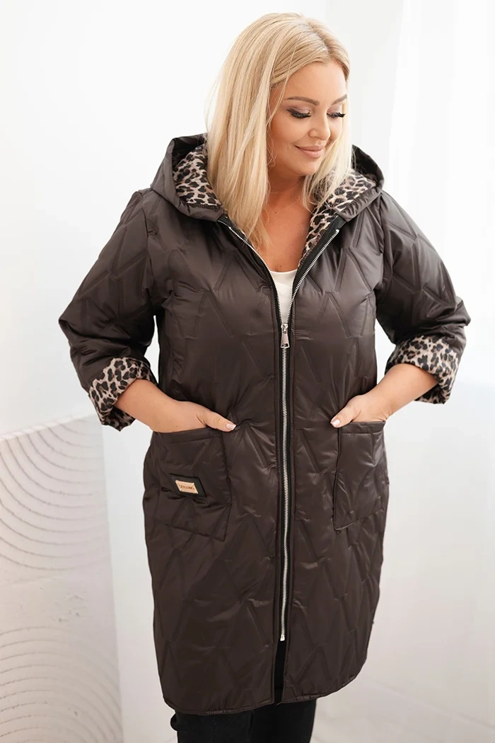 Kurtka damska zimowa pikowana Plus Size z podszewką w panterkę i kapturem brązowa