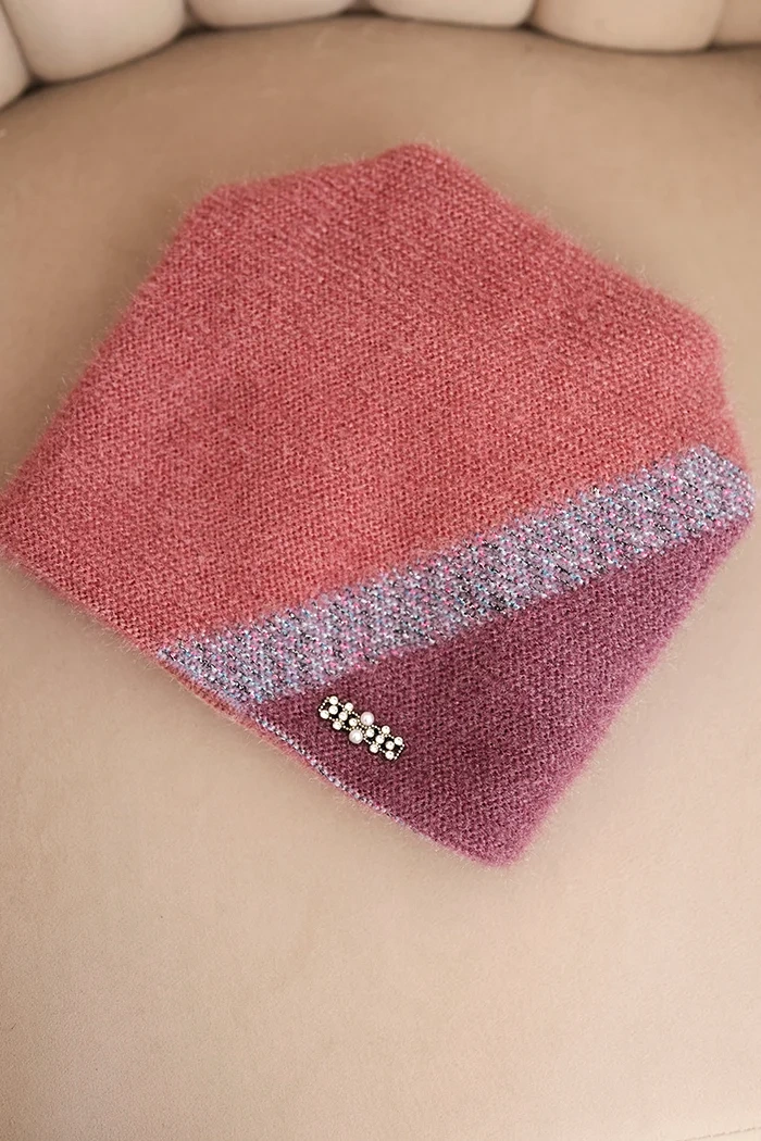 Czapka damska zimowa z puszystej dzianiny z ozdobną aplikacją różowy + ciemno fioletowy