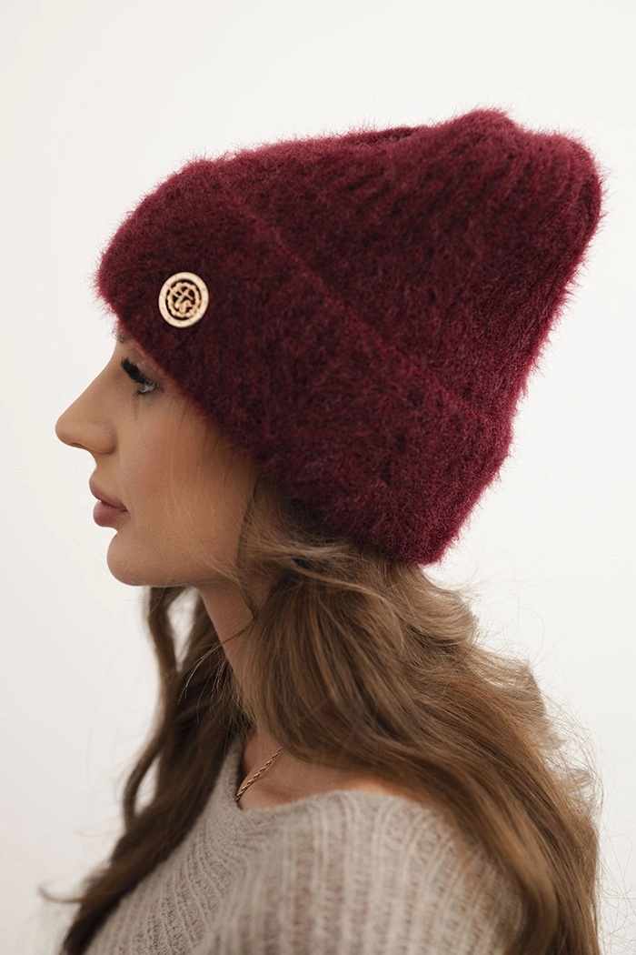 Czapka damska zimowa z puszystej dzianiny i z eleganckim guzikiem bordowa