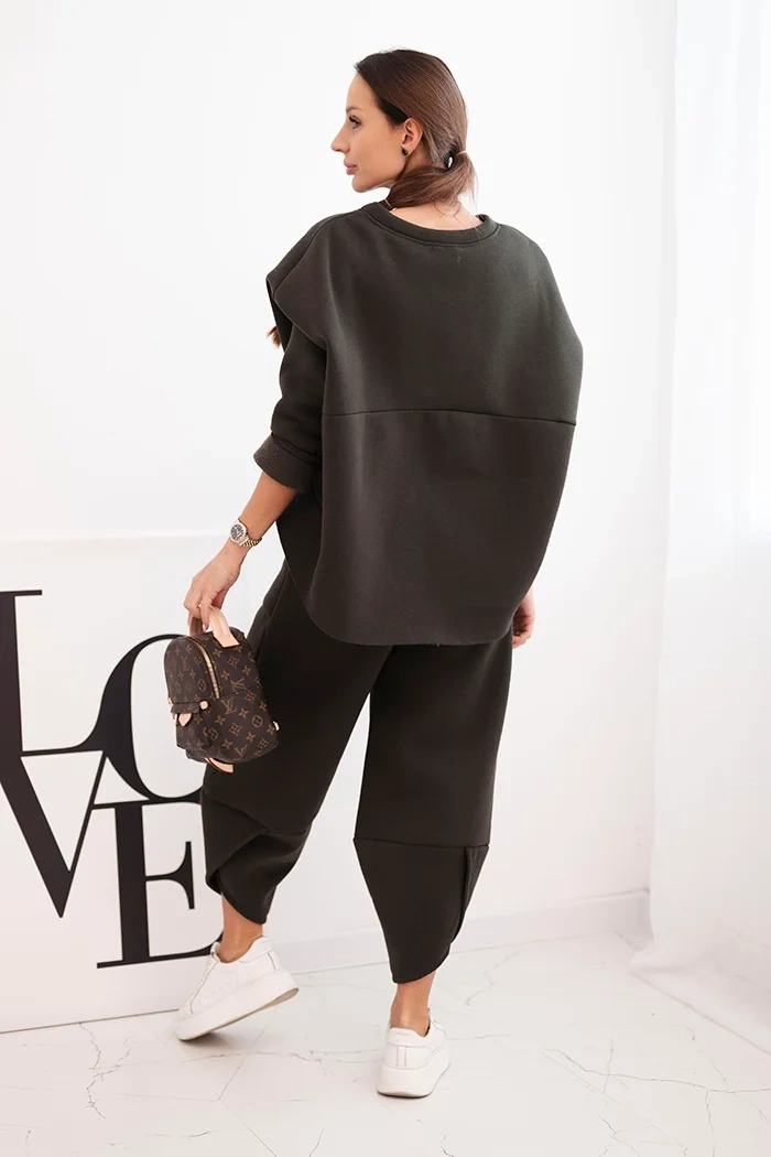 Komplet sprawdzi się zarówno na co dzień, do relaksu w domu, jak i na spacer czy zakupy. Charakterystyczne, duże kieszenie w spodniach oraz obniżony krok nadają mu nowoczesnego, streetwearowego charakteru. Bluza z zaokrąglonym dekoltem i opuszczoną linią ramion wpisuje się w aktualne trendy modowe.