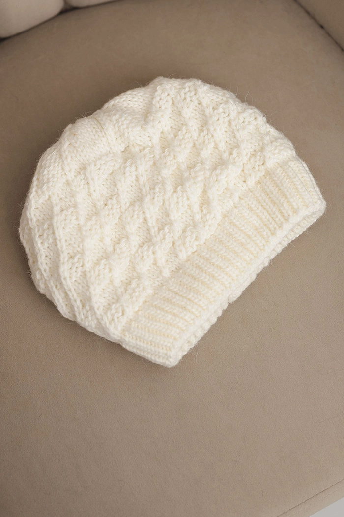 Stylowa i ciepła czapka damska wykonana z wysokiej jakości przędzy z dodatkiem wełny. Posiada dekoracyjny, ażurowy splot, który nadaje jej wyjątkowego charakteru, a elastyczna struktura sprawia, że dopasowuje się do każdego kształtu głowy.