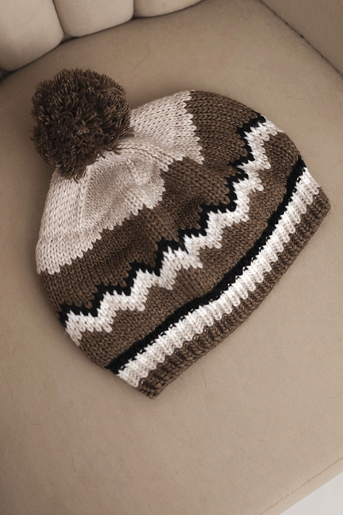 Czapka damska zimowa wełniana z pomponem i kolorowym wzorem K435 beżowa + mocca