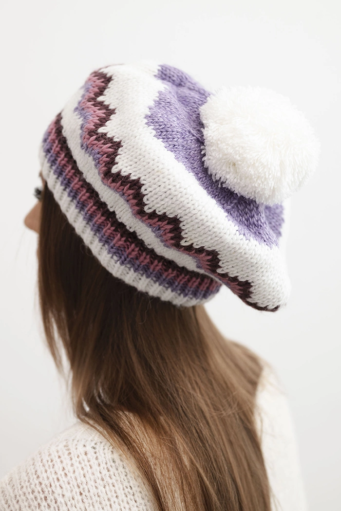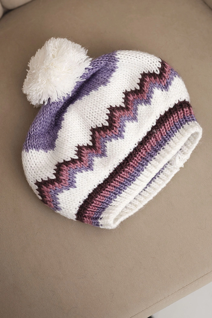 Czapka damska zimowa wełniana z pomponem i kolorowym wzorem K435 fioletowa + biała