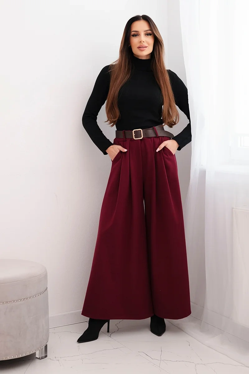Spodnie damskie z szeroką nogawką i paskiem bordowe