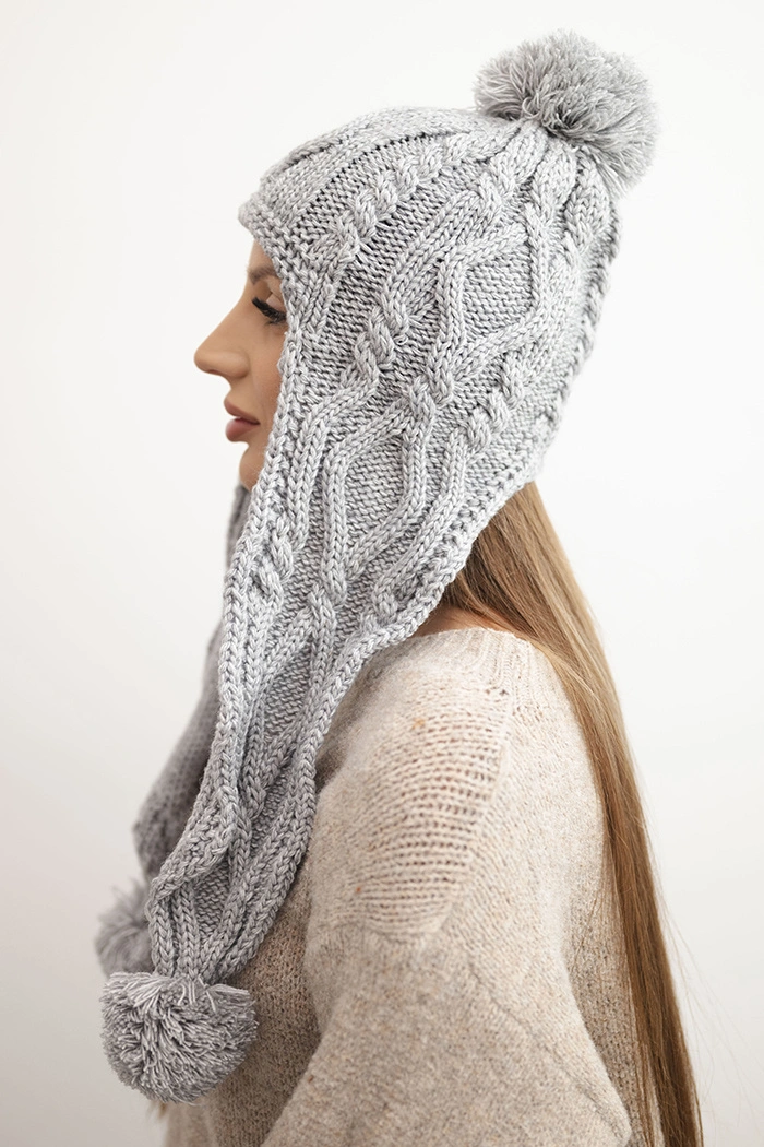 Czapka damska zimowa wełniana z pomponami i przedłużanymi bokami K448 szara