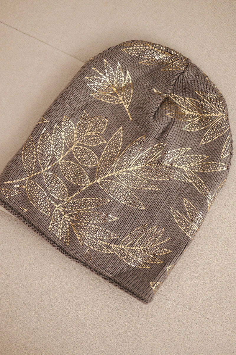 Stylowa czapka damska o delikatnym połysku, wykonana z wysokiej jakości dzianiny z dodatkiem moheru i wełny. Złoty, roślinny wzór przyciąga wzrok i dodaje elegancji, dzięki czemu czapka idealnie sprawdzi się zarówno na co dzień, jak i jako modny akcent do zimowych stylizacji.