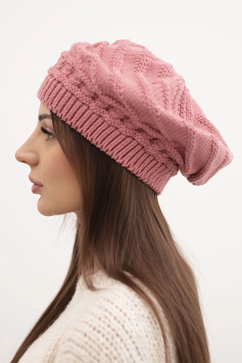 Stylowa czapka damska o luźnym kroju typu beret, wykonana z miękkiej przędzy o wyrazistym splocie. Świetnie sprawdzi się w zimowe dni, łącząc komfort noszenia z wyjątkowym wyglądem. Elastyczny ściągacz dobrze trzyma czapkę na głowie, jednocześnie nie uciskając.