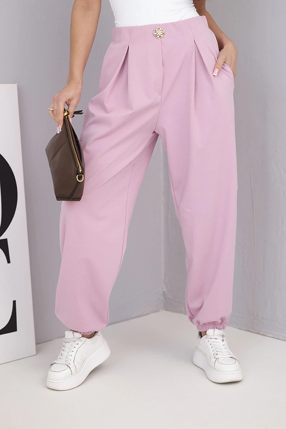 Spodnie damskie bawełniane z wysokim stanem i ozdobnym guzikiem ciemno różowe