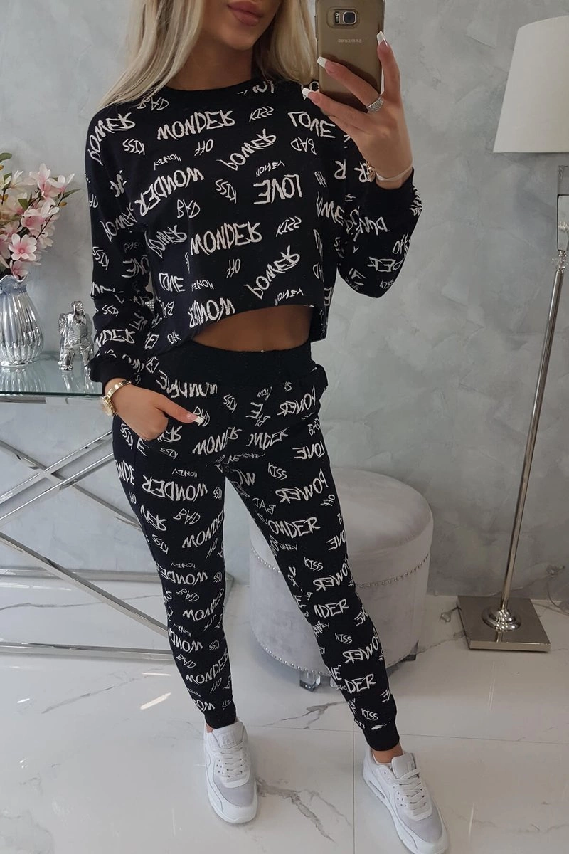 Prezentujemy Państwu komplet bluzki i spodni. Bluzka oraz spodnie z nadrukiem. Komplet wykonany jest z wysokiej jakości materiału. Rozmiar jest uniwersalny i będzie odpowiedni dla Pań w rozmiarze S, M lub L.