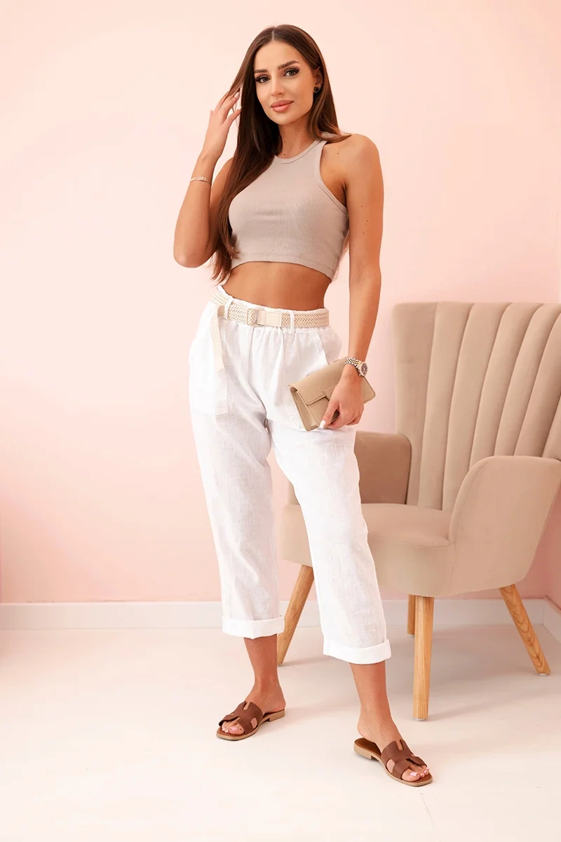 Dámske ľanové nohavice s bavlnou a opaskom biele