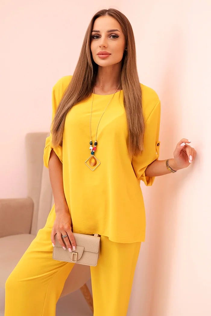 Dámska súprava s blúzkou s náhrdelníkom a širokými nohavicami žltý