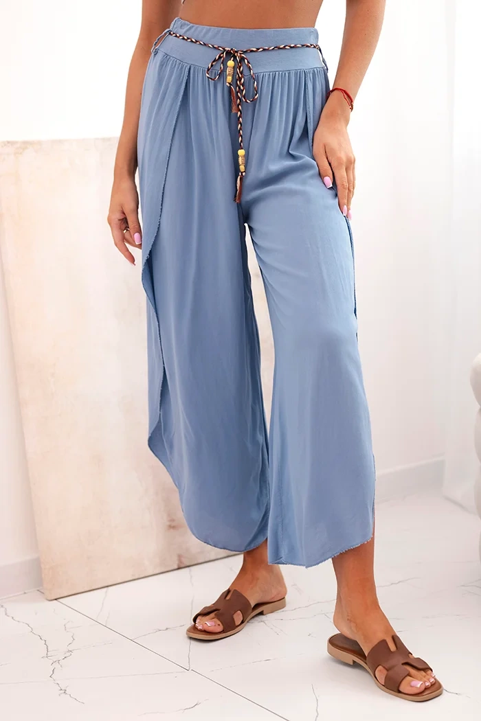 Tieto dámske nohavice so širokými nohavicami sú ideálnou voľbou na teplejšie dni. Vyrobené zo 100 % priedušnej viskózy, zaručujú pohodlie a ľahkosť počas celého dňa. Voľný, vzdušný strih nielen dodáva štýl, ale tiež zabezpečuje voľnosť pohybu. Dekoratívna šnúrka v páse pridáva na pôvabe a umožňuje lepšie prispôsobenie. Skvelý model na dovolenky, prechádzky mestom alebo letné stretnutia – môžete ich skombinovať s topom, košeľou alebo ľahkou blúzkou. Talianska výroba je zárukou kvality a štýlového vzhľadu. Veľkosť je univerzálna a bude vhodná pre dámy veľkosti S, M alebo L.