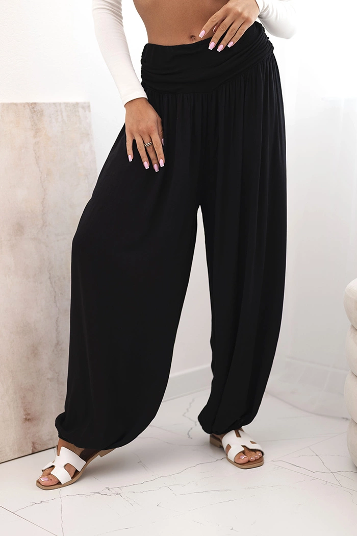 Dámske viskózové nohavice so širokými nohavicami a volánikmi čierny