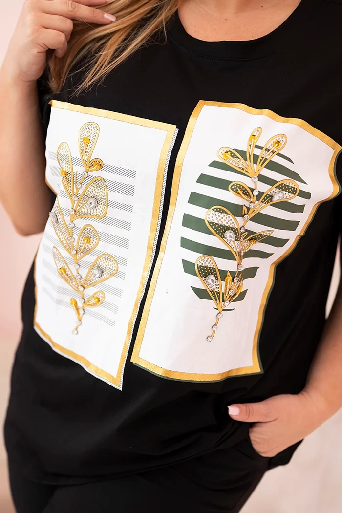 Dámska bavlnená blúzka Plus Size s kamienkami čierna + khaki