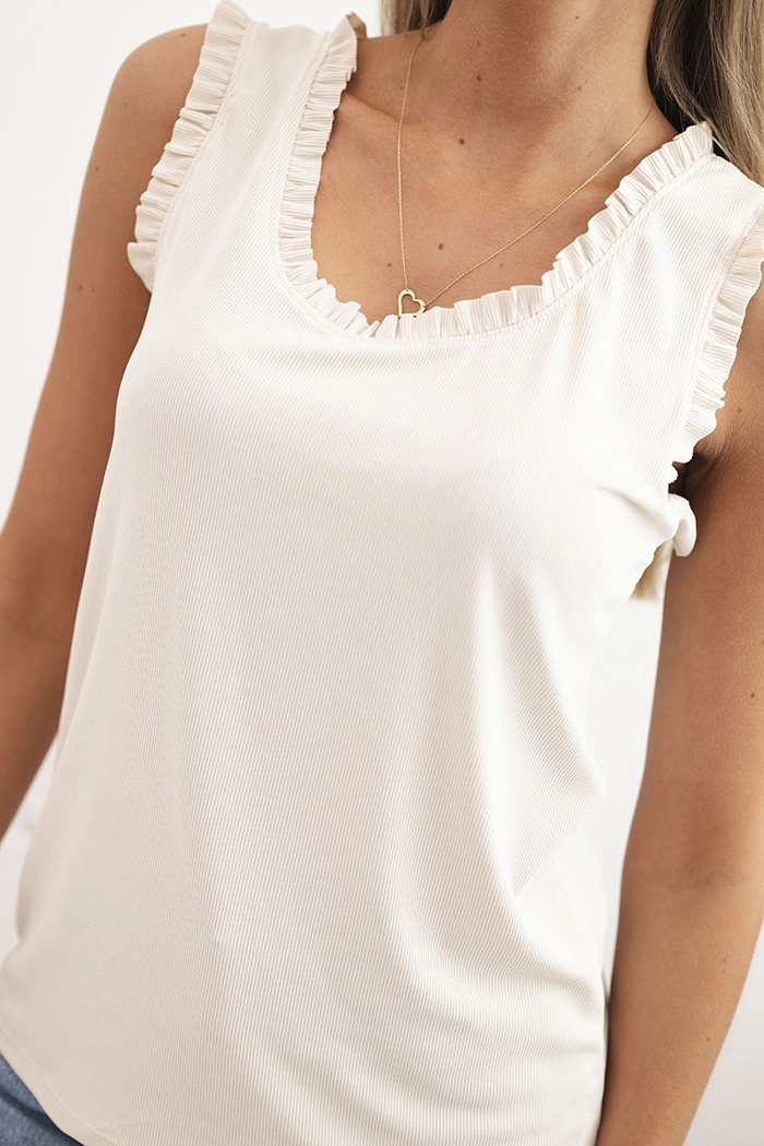 Štýlová a mimoriadne ženská dámska blúzka bez rukávov je ideálnou voľbou na teplejšie dni. Vyrobená z príjemnej viskózy s prídavkom elastanu, výborne sa prispôsobí postave a poskytuje vysoký komfort nosenia počas celého dňa. Jemné volániky pri výstrihu a na ramenách jej dodávajú romantický nádych. Skvelá voľba na každodenné nosenie aj elegantnejšie príležitosti – stačí ju skombinovať s obľúbenou sukňou alebo nohavicami.