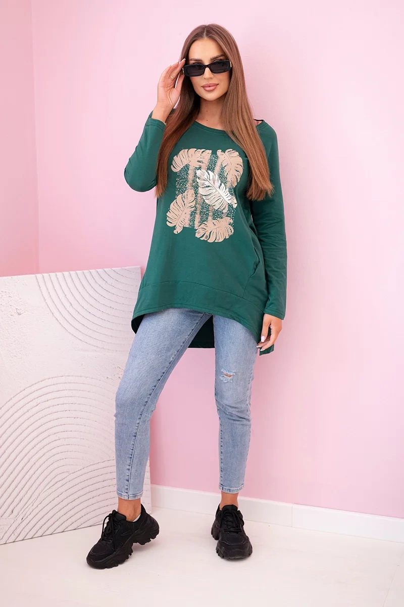 Štýlová a pohodlná dámska blúzka s 3/4 rukávom je výbornou voľbou na každý deň. Vyniká originálnou potlačou s motívom listov a moderným strihom s predĺženým zadným dielom, ktorý jemne zoštíhľuje postavu. Výstrih do lodičky dodáva ženskosť a bočné vrecká zvyšujú komfort a funkčnosť. Skvele sa hodí k džínsom, legínam alebo klasickým nohaviciam – ideálna do práce, na prechádzky alebo stretnutie s priateľmi. Materiál s vysokým podielom bavlny zaručuje priedušnosť a pohodlie počas celého dňa, zatiaľ čo elastan zaisťuje voľnosť pohybu. Veľkosť je univerzálna a vhodná pre ženy s veľkosťou S, M alebo L.