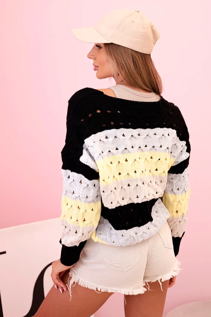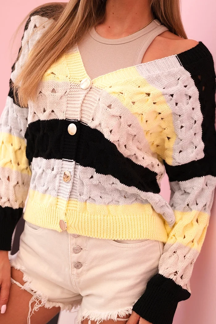 Tento roztomilý dámsky kardigán s farebnými pruhmi je ideálny návrh na každé ročné obdobie. Vyrobený z mäkkého, na dotyk príjemného akrylu, skvele poslúži na chladnejšie dni, ako aj ako štýlové doplnenie jarných outfitov. Čipkovaný vzor mu dodáva ľahkosť a ženské kúzlo, a klasický výstrih do V krásne zvýrazňuje krk. Kardigán sa zapína na gombíky, čo mu pridáva praktickosť a umožňuje ho nosiť rôznymi spôsobmi – ako rozopnutý, tak aj zapnutý. Je to vynikajúca voľba pre ženy, ktoré si cenia pohodlie, farbu a módny vzhľad. Vďaka pastelovým farbám ho ľahko prispôsobíte mnohým outfitom – od casual po romantickejšie kombinácie. Skvele vyzerá s džínsami, sukňou alebo šatami. Veľkosť je univerzálna a bude vhodná pre dámy vo veľkosti S, M alebo L.
