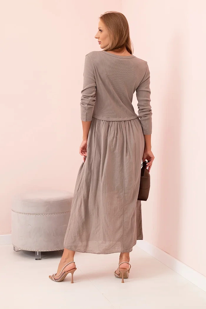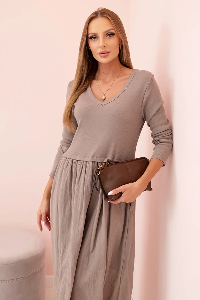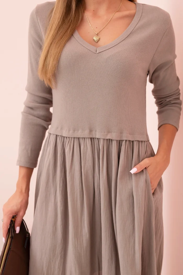 Vzdušné dámske šaty ušité z príjemnej na dotyk bavlnenej pleteniny, ktorá sa krásne prispôsobuje postave. Vrchná časť z rebrovanej látky zvýrazňuje ženskú líniu, zatiaľ čo spodná časť s jemne nariaseným zakončením pridáva ľahkosť. Hlboký výstrih do V opticky predlžuje krk a dlhý rukáv zabezpečuje pohodlie v chladnejších dňoch.