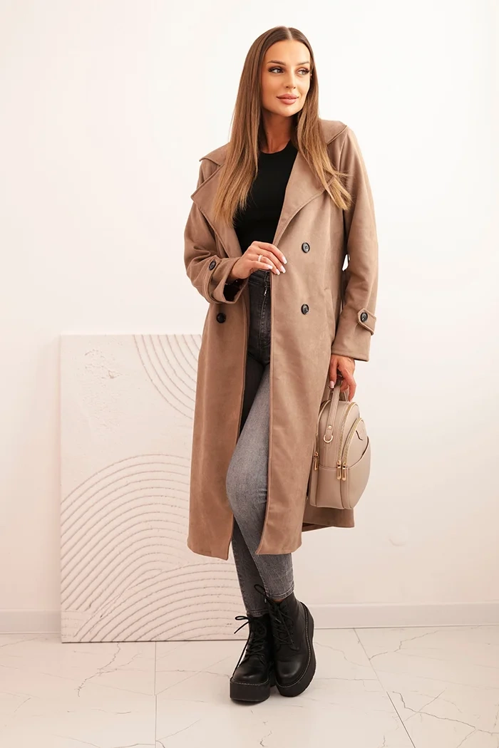 Dámsky kabát z semišu viazaný v páse s golierom a gombíkmi fango