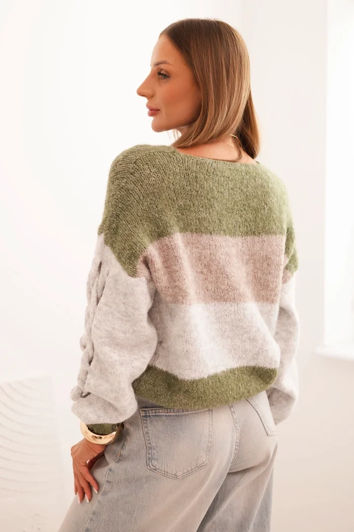 Dámsky sveter s pruhmi a vrkočmi na rukávoch z vlny khaki + šedý