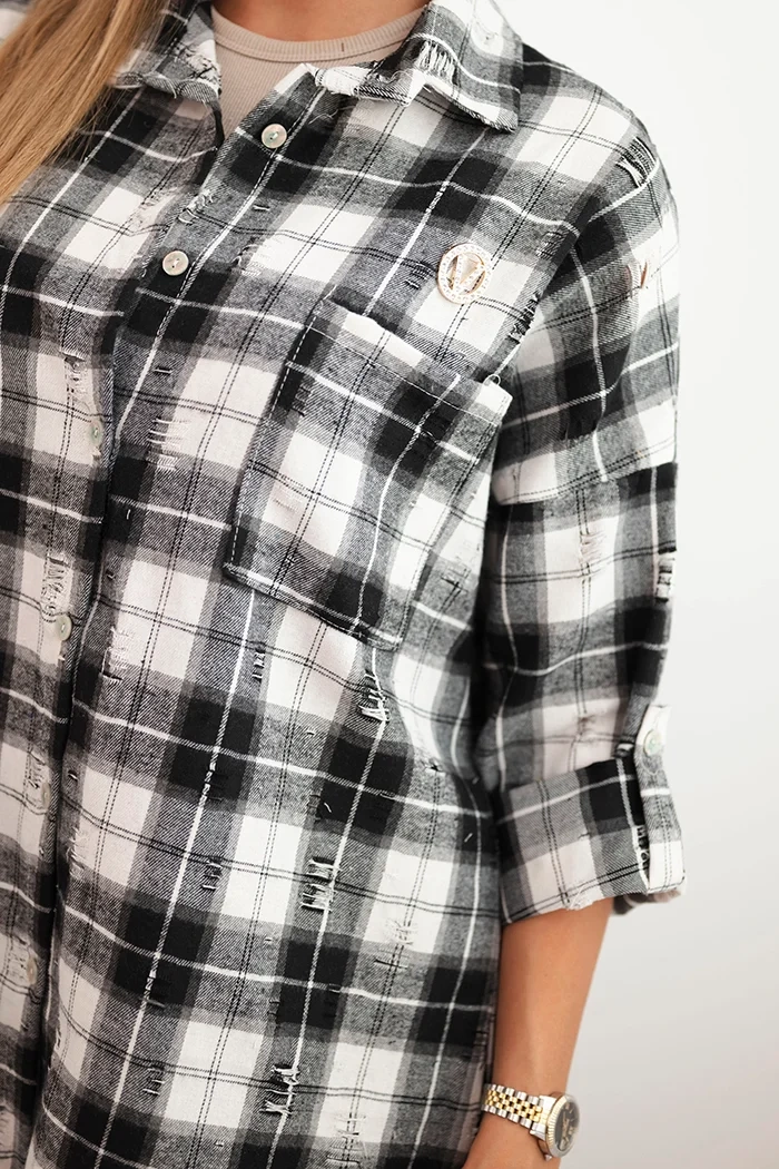 Košeľa má klasický golier, zapínanie na gombíky a vrecko na prsiach. Pozornosť priťahuje módny efekt obnošenia, ktorý jej dodáva charakter a moderný štýl. Voľnejší strih zabezpečuje slobodu pohybu a predĺžený zadný diel spôsobuje, že skvele vyzerá ako k džínsom, tak aj k legínam.