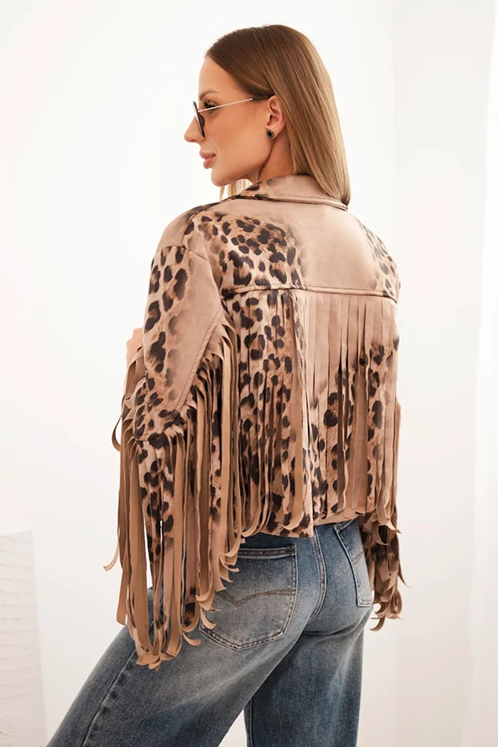 Dámska semišová bunda s leopardím vzorom a strapcami je ideálnym návrhom pre ženy, ktoré sa radi odlišujú štýlovým, odvážnym vzhľadom. Pôsobivý leopardí vzor skombinovaný s dlhými strapcami vytvára jedinečný boho charakter s nádychom rockovej atmosféry.