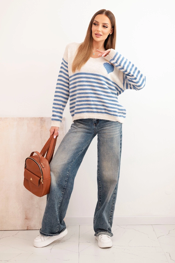 Dámsky pruhovaný sveter so srdcom z mohairu a V-dekoltom denimový zelený