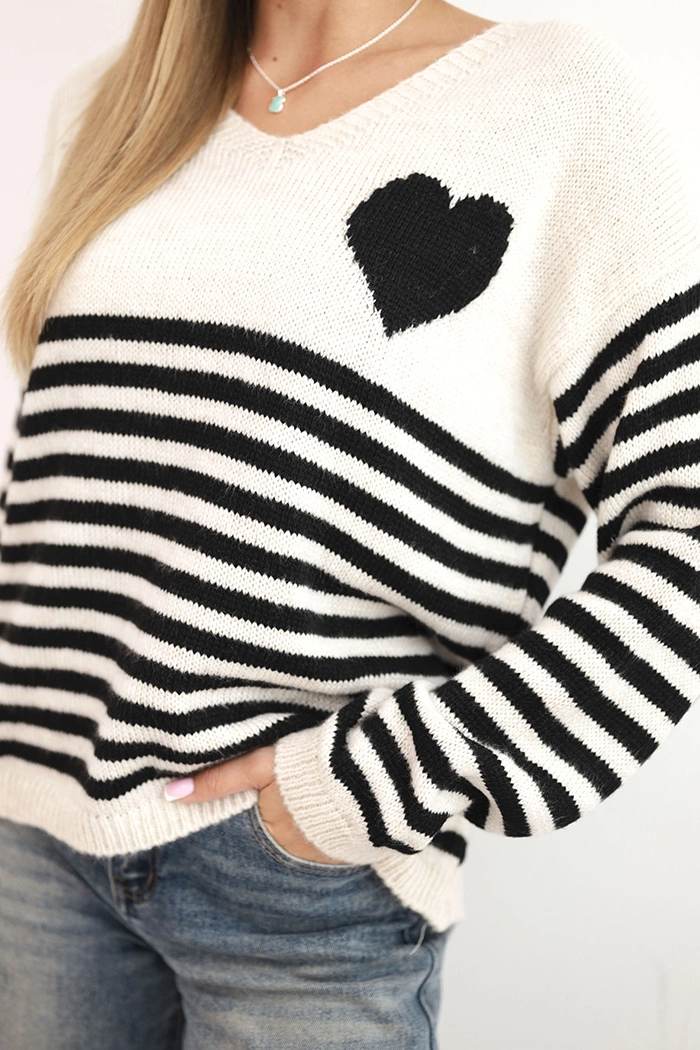 Dámsky sveter pruhovaný so srdcom z mohairu a výstrihom do V čierny