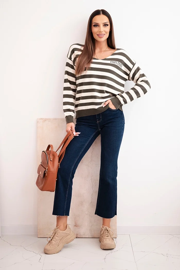 Tento dámsky pruhovaný sveter s klasickým výstrihom do V je kombináciou nadčasového štýlu a každodennej pohodlnosti. Vyrobený z mäkkej a elastickej pleteniny, poskytuje príjemný pocit na pokožke a komfort nosenia po celý deň. Horizontálne pruhy mu dodávajú módny charakter a nápis „min min“ ho subtilne odlišuje od klasických strihov.