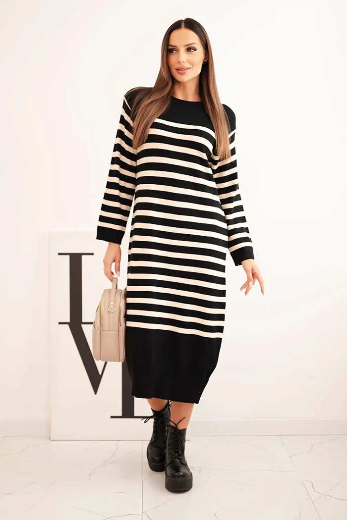 Štýlová dámska pletená šaty s módnym prúžkovaným vzorom je ideálnym návrhom na chladnejšie dni. Pohodlný strih a rukáv 3/4 robí, že vyzerá žensky a moderne. Mäkko materiál s prevahou viskózy sa dokonale prispôsobuje postave a poskytuje komfort po celý deň.