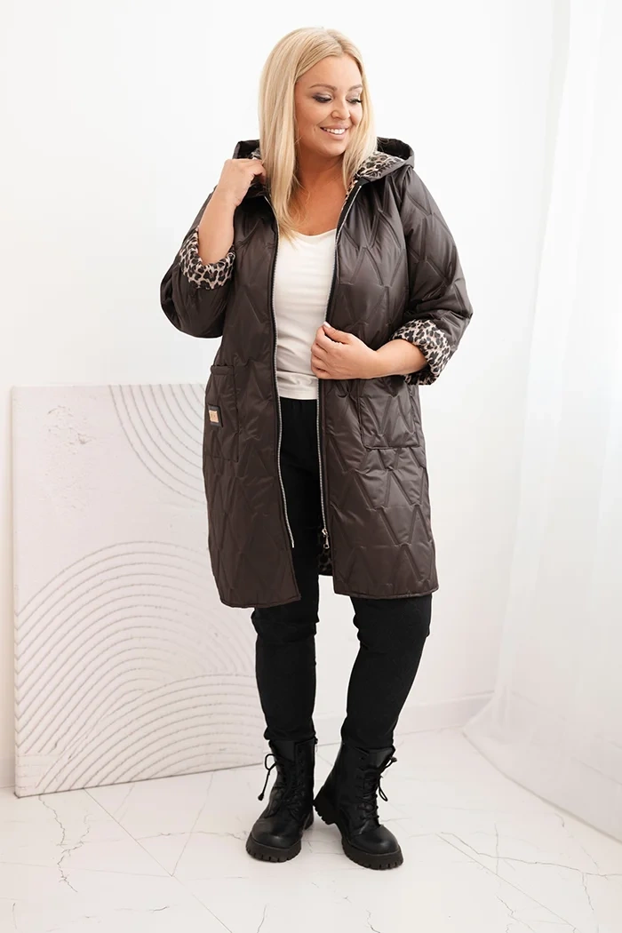 Dámska zimná prešívaná bunda Plus Size s podšívkou v leopardom vzore a kapucňou hnedá