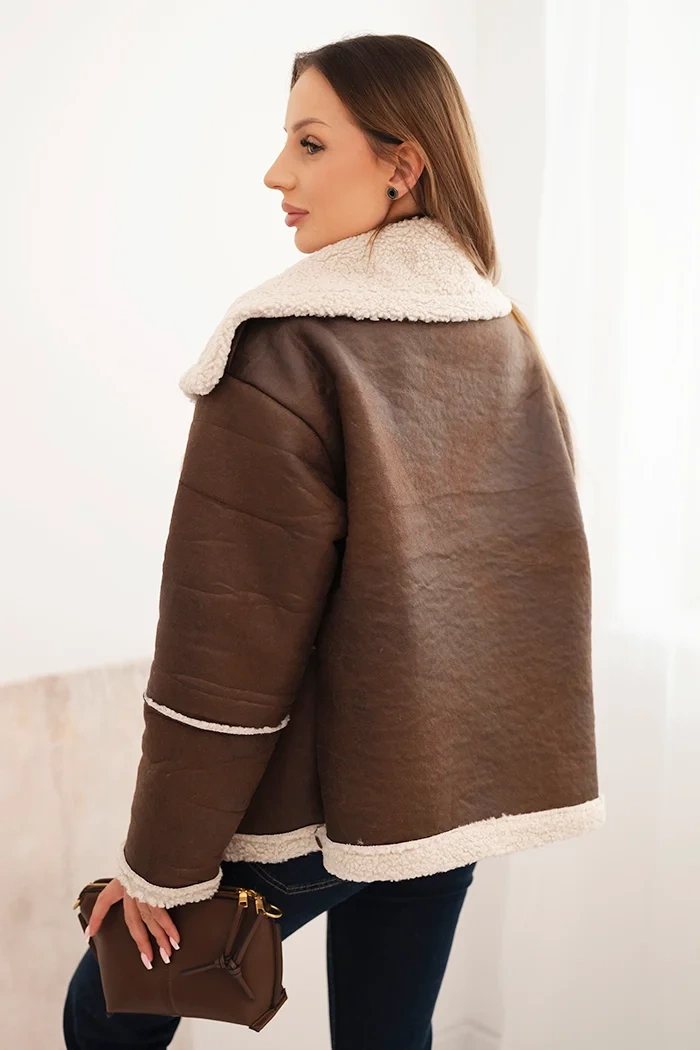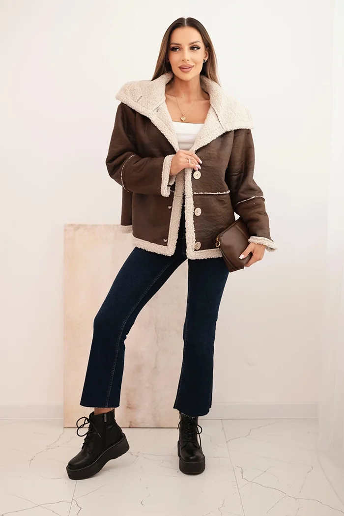 Kratší strih zabezpečuje ľahkosť a voľnosť nosenia, a široké rukávy s prevráteným kožúškom dodávajú celku štýlový vzhľad. Model je skvelý na jeseň a začiatok zimy – ako k džínsom, tak aj k šatám.