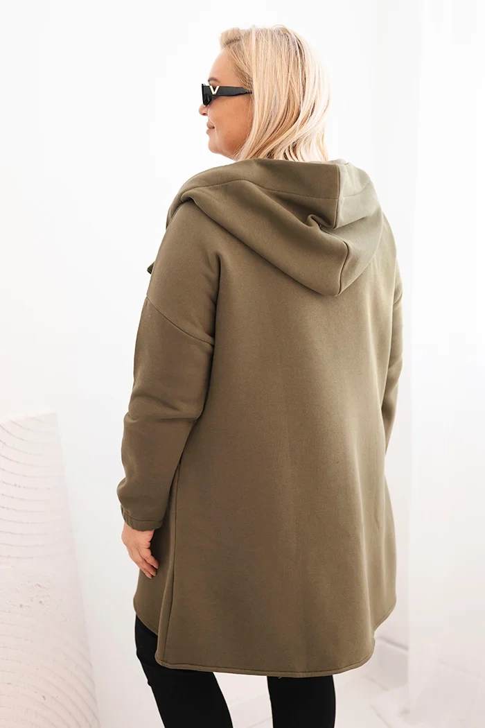 Toto je dámska mikina, ktorá spája komfort každodenného nosenia s nebanálnym dizajnom! Tento Plus Size model s kapucňou a efektným asymetrickým zipsom je návrh pre ženy, ktoré majú radi módu s charakterom. Vďaka voľnému strihu sa skvele prispôsobuje siluete, zakrývajúc nedokonalosti a zabezpečujúc slobodu pohybu. Pohodlné rukávy zakončené jemnou gumičkou a dĺžka siahajúca za boky robia z mikiny ideálny kúsok na chladnejšie dni – na každý deň, na prechádzku alebo do práce.