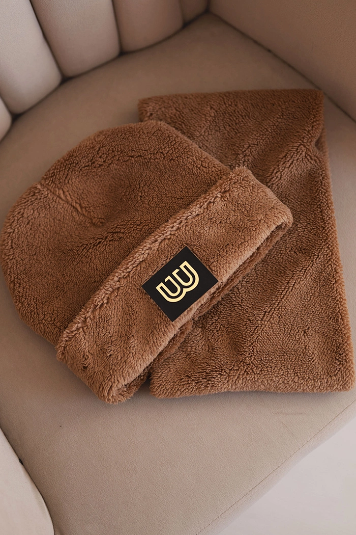 Dámsky polarový komplet čiapka a nákrčník s ozdobnou nášivkou camelový