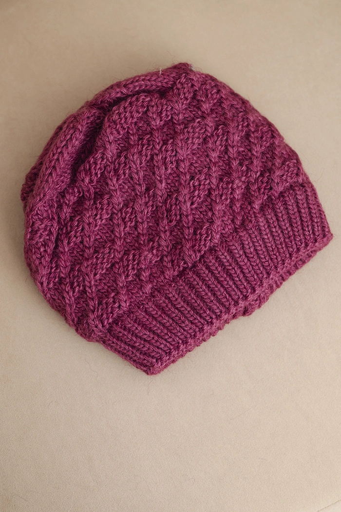 Štýlová a teplá dámska čiapka vyrobená z vysoko kvalitnej priadze s prídavkom vlny. Má dekoratívny, ašurový vzor, ktorý jej dodáva výnimočný charakter, a elastická štruktúra zabezpečuje, že sa prispôsobí každému tvaru hlavy.