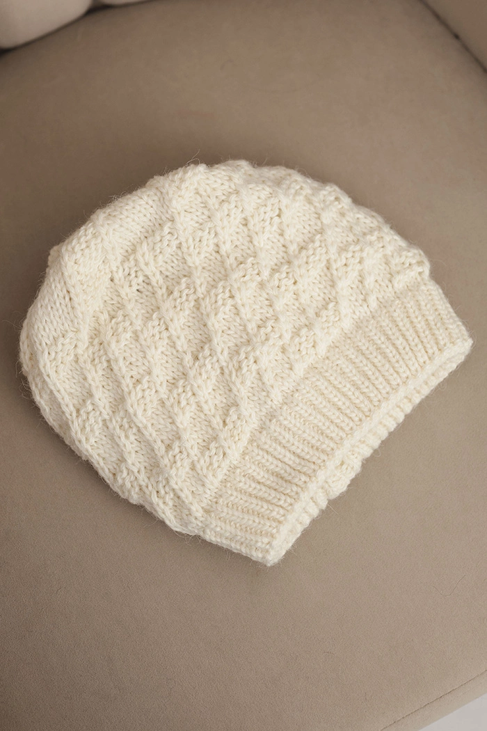 Štýlová a teplá dámska čiapka vyrobená z vysoko kvalitnej priadze s prídavkom vlny. Má dekoratívny, ašurový vzor, ktorý jej dodáva výnimočný charakter, a elastická štruktúra zabezpečuje, že sa prispôsobí každému tvaru hlavy.