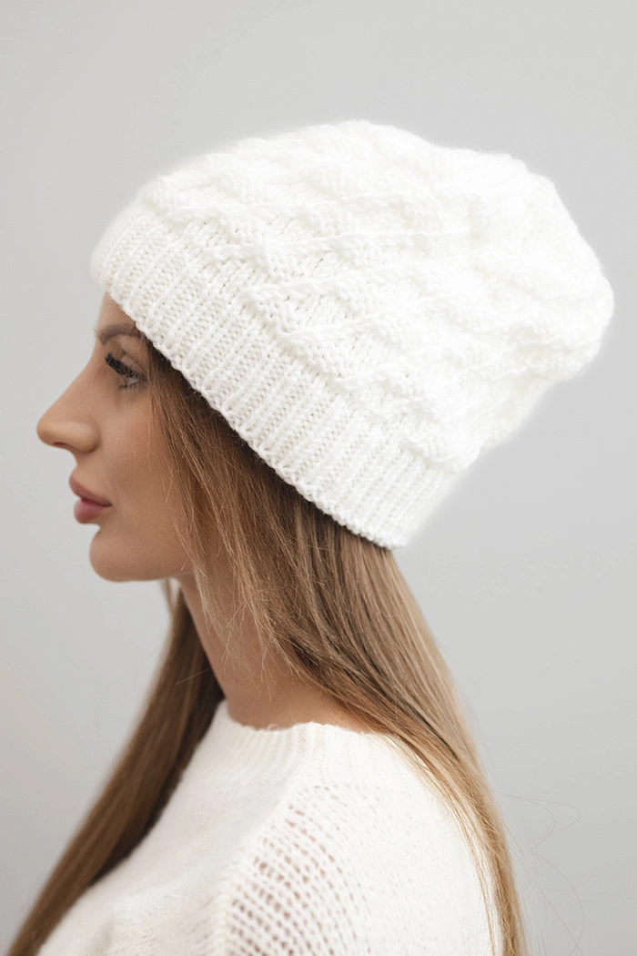 Štýlová a teplá dámska čiapka vyrobená z vysoko kvalitnej priadze s prídavkom vlny. Má dekoratívny, ašurový vzor, ktorý jej dodáva výnimočný charakter, a elastická štruktúra zabezpečuje, že sa prispôsobí každému tvaru hlavy.