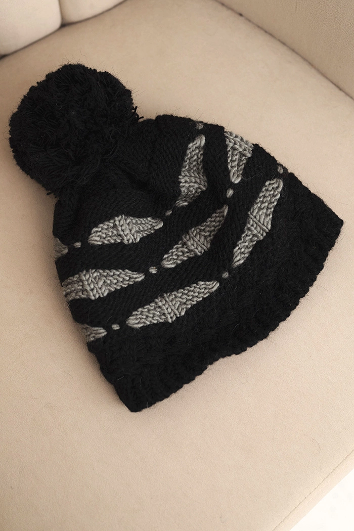 Stylová a teplá dámska čiapka s výrazným vzorom v kontrastných farbách. Vyrobená z vysoko kvalitnej priadze, zabezpečuje termický komfort a módny vzhľad v zimných dňoch. Dokončená veľkým, nadýchaným pom-pomom.