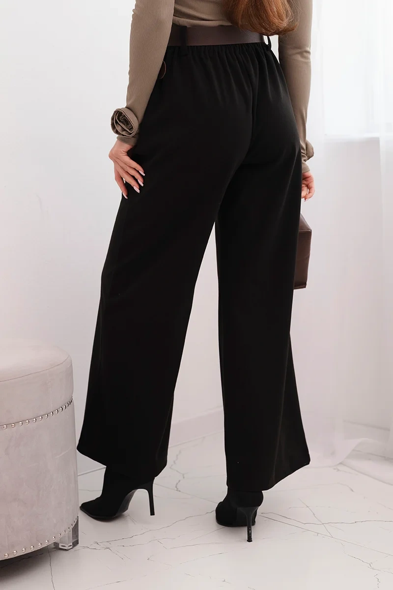 Tieto dámske elegantné nohavice so širokým strihom sú ideálnou voľbou pre ženy, ktoré si cenia klasiku spojenú s pohodlím. Model je vyrobený z mäkkej, elastickej tkaniny, ktorá dobre sedí na postave. V súprave sa nachádza štýlový opasok s obdĺžnikovou prackou, ktorý zvýrazňuje pás a pridáva celku eleganciu. Nohavice majú praktické vrecká a gumu v páse, čo zaisťuje komfort nosenia. Široký strih dodáva moderný, módny charakter.