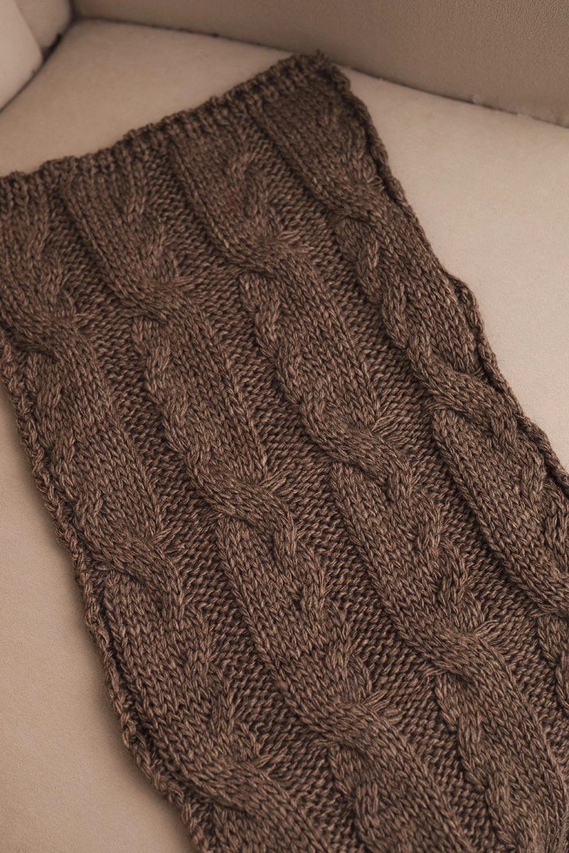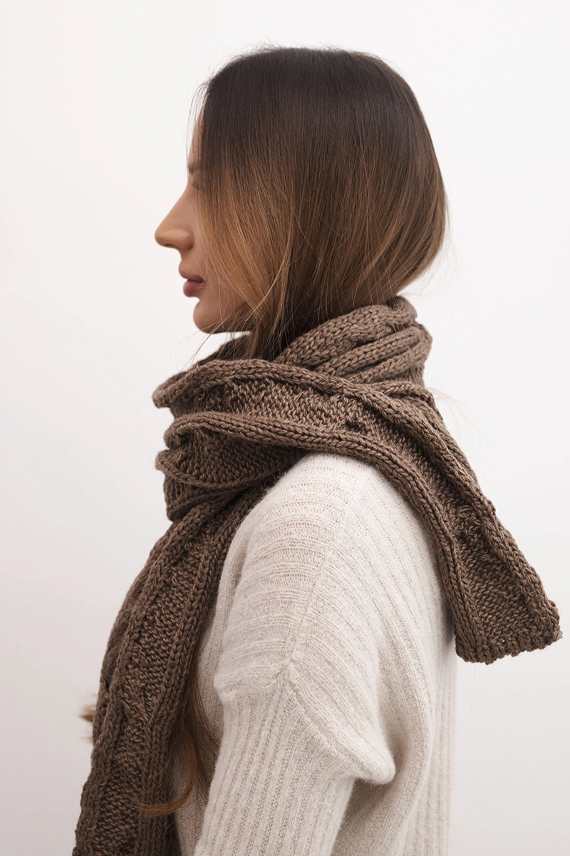Stylový, teplý dámsky šál vyrobený z mäkkej a príjemnej na dotyk priadze s prídavkom prírodnej vlny. Klasický vrkočový vzor mu dodáva elegantný charakter, ktorý sa hodí ako do každodenných, tak aj do formálnejších stylizácií.