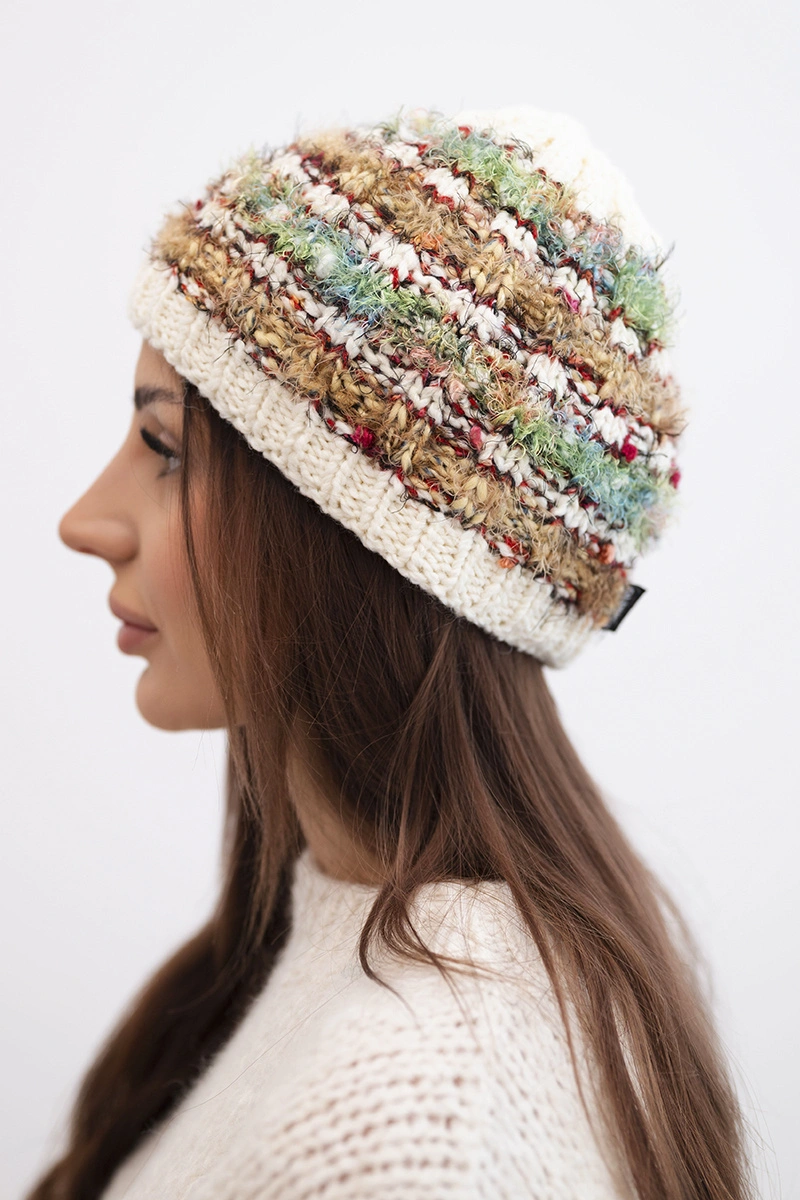 Dámska zimná čiapka s farebnou priadzou a elastickým sťahovaním K352 ecru+zelený+camelový