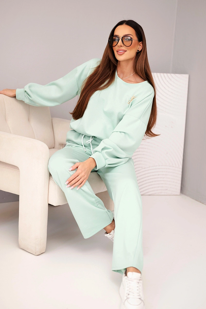 Komplet dámsky maslo mikina s brošňou a nohavice s rovnou nohou tmavo mentolová