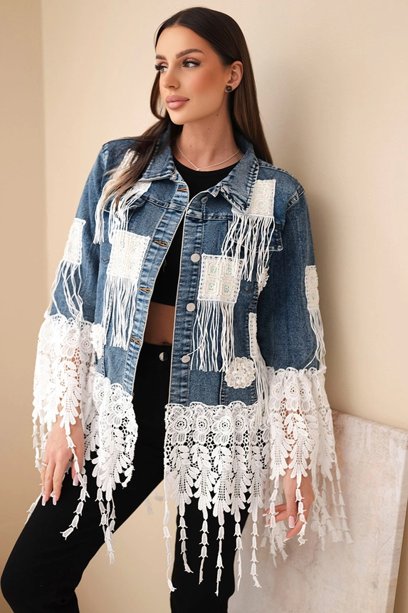 Dámska jeansová bunda z bavlny s strapcami a čipkou v boho štýle tmavo jeansová